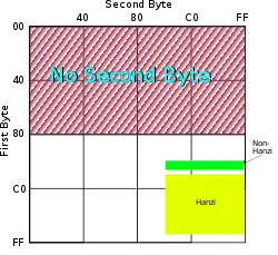 - Lead bytes 0xC3–E1, trail bytes 0x40–64
