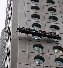 Cleaning a skyscraper on a suspended stage.