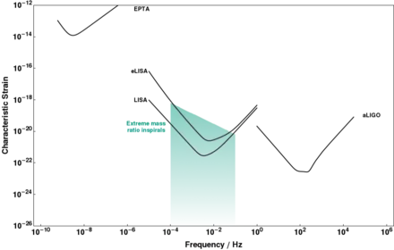 The main reason for scientific interest in EMRIs is that they are one of the most promising sources for gravitational wave astronomy using future space-based detectors such as the Laser Interferometer Space Antenna (LISA).[2] If such signals are successfully detected, they will allow accurate measurements of the mass and angular momentum of the central object, which in turn gives crucial input for models for the formation and evolution of supermassive black holes.[3] Moreover, the gravitational wave signal provides a detailed map of the spacetime geometry surrounding the central object, allowing unprecedented tests of the predictions of general relativity in the strong gravity regime.[4]