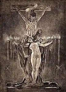 Les Sataniques (The Satanic) was a series of his own initiative, independent of his book illustrations and literary works. Dating from about 1882, there are a number of closely related drawings, watercolors, sketches, and other mixed media pieces, as well as prints in various states of development. He had hoped to do a large series and eventually publish them in the form of a book, but this never came to fruition. Ultimately a set of five heliogravures (based on five original drawings) were published, including: Satan semant l'ivraie (Satan Sowing Tare), L'enlèvement (The Abduction), Le Calvaire (The Calvary), L'idole (The Idol), and Le Sacrifice (The Sacrifice). The frontispiece of the cycle, Satan Sowing Tare, which appeared in several versions, was based on the Biblical Parable of the Tares which appears in Matthew 13:24-13:30. This series ranks among the more familiar and discussed images of his work. There is nothing in the dozens of references below to suggest that Rops was actively involved or a believer in Satanism, and his use of this subject was only symbolic or metaphoric.[1]:243 p.[8]
