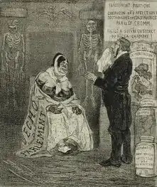 French art critic and historian Jean Cassou posited three distinct periods in Rops's artistic life: romantic 1855–1860; symbolist 1860–1870; realist 1871–1898.[2] While these dates are not supported by others,[8][5] and are contrary to even the most cursory examination of the work [e.g., symbolist works such as Pornocrates (1878); Les Sataniques (1882); The Lyre frontispiece for Poésies by Mallarmé (1895); and Parallelism, the frontispiece for Chair [Flesh] by Verlaine (1896) were produced in Cassou's posited "realist 1871–1898" period], Cassou's association of Rops with realism is valid and important in understanding his work. Whether drawing genre subjects or decadent Parisian nightlife, Rops produced realist images throughout his artistic life and they constitute a significant part of his oeuvre. This aspect of his work is often marginalized or ignored by authors who are preoccupied with his erotic and satanic images (enthusiastically or negatively).[2][8][18]