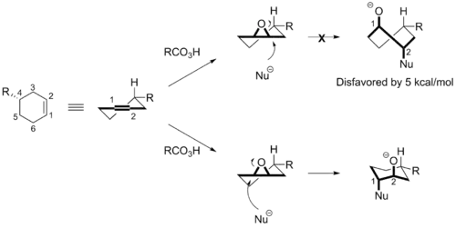 Epoxidation of a substituted cyclohexene affords a product where the R group resides in the pseudo-equatorial position. Nucleophilic opening of this epoxide can occur by attack at either the 1 or 2 position. The major product forms from attack at the 1 position, due to the instability of the twist boat product formed by addition at the 2 position (disfavored by approximately 5 kcal/mol).[2] Similarly, the Fürst-Plattner rule applies to nucleophilic additions to imines and halonium ions.