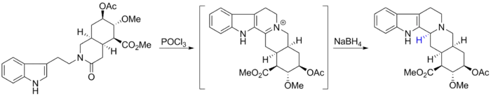 Woodward's synthetic strategy used a Bischler-Napieralski reaction to form the tetrahydrocarbazole portion of Reserpine. The subsequent imine intermediate was treated with sodium borohydride, affording the wrong stereoisomer due to the Fürst-Plattner effect.