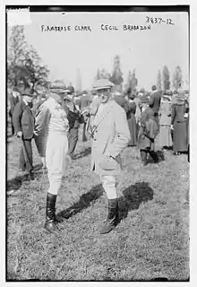 Clark looked to be a man who stepped right out of a 19th-century sporting print. He was almost always seen in a tweed English cap, waistcoat, breeches and tall boots throughout his life in person and in captured images. He was master of hounds for the Meadow Brook Hounds in the 1920s,[9] which annually held a well-attended steeplechase race meeting on his property in Old Westbury, starting in 1919.[1] Always the consummate horseman with a disdain for automobiles, famously Brose would not allow NBC radio to drive their equipment truck onto the estate to broadcast the races. Rather they had to use a team of horses to haul the equipment in.