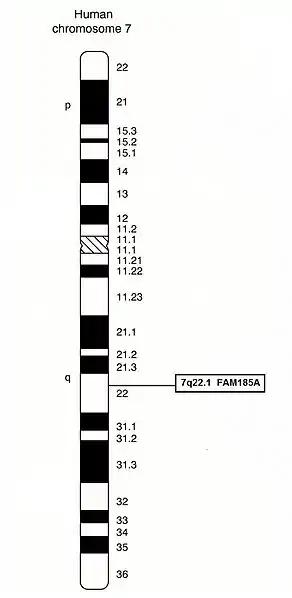 The FAM185A (Gene Family with sequence similarity 185, member A) is a protein that in humans is encoded by the FAM185A gene. The FAM185A gene is found on the positive strand of Chromosome 7 at 7q22.1. The gene begins 102,389,399bp from the p-terminus of the chromosome and ends at 102,449,672bp from the p-terminus; it covers a total of 73,308 basepairs.[4] The protein encoded by this gene is characterized by the presence of multiple copies of DUF4098 (Domain of unknown function, 4098) near its C-terminus. It is described as a Long Interspersed Nuclear Element (LINE), a subclass of penaeid repetitive elements (PREs).[5]