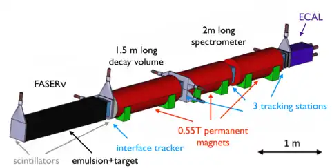 Located at the front end of FASER is the FASERν neutrino detector. It consists of many layers of emulsion films interleaved with tungsten plates as target material for neutrino interactions. Behind FASERν and at the entrance to the main detector is a charged particle veto consisting of plastic scintillators.[6][7] This is followed by a 1.5 meter long empty decay volume and a 2 meter long spectrometer, which are placed in a 0.55 T magnetic field. The spectrometer consists of three tracking stations, composed of layers of precision silicon strip detectors, to detect charged particles produced in the decay of long-lived particles. Located at the end is an electromagnetic calorimeter.