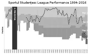 Domestically, Sportul Studenţesc's best league performance was a second-place finish in the 1985–86 season, just behind (back then) European Champions, Steaua București. In the Romanian Cup, Sportul Studenţesc made it to the final on three occasions, in 1938–1939, 1942–1943, and 1978–1979 losing all three matches to Rapid București, CFR Turnu Severin, and Steaua București, respectively.