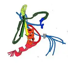 Fermitin family homolog 3) (FERMT3), also known as kindlin-3 (KIND3), MIG2-like protein (MIG2B), or unc-112-related protein 2 (URP2) is a protein that in humans is encoded by the FERMT3 gene.[5][6][7] The kindlin family of proteins, member of the B4.1 superfamily, comprises three conserved protein homologues, kindlin 1, 2, and 3. They each contain a bipartite FERM domain comprising four subdomains F0, F1, F2, and F3 that show homology with the FERM head (H) domain of the cytoskeletal Talin protein. Kindlins have been linked to Kindler syndrome, leukocyte adhesion deficiency, cancer and other acquired human diseases. They are essential in the organisation of focal adhesions that mediate cell-extracellular matrix junctions and are involved in other cellular compartments that control cell-cell contacts and nucleus functioning. Therefore, they are responsible for cell to cell crosstalk via cell-cell contacts and integrin mediated cell adhesion through focal adhesion proteins and as specialised adhesion structures of hematopoietic cells they are also present in podosome's F actin surrounding ring structure. Isoform 2 may act as a repressor of NF-kappa-B and apoptosis[8]