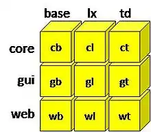 A multi-dimensional product line is described by multiple interacting sets of features.[1] [2] [3] [4] As an elementary 2D example, it is easy to create a product line of calculators, where variants offer different sets of operations. Another variation might offer different presentation front ends to calculators, one with no GUI, another with a Java GUI, a third with a web GUI. These variations interact: each GUI representation references a specific calculator operation, so each GUI feature cannot be designed independently of its calculator feature. Such a design leads to a matrix: columns represent increments in calculator functionality, and rows represent different presentation front-ends. Such a matrix M is shown to the right: columns allow one to pair basic calculator functionality (base) with optional logarithmic/exponentiation (lx) and trigonometric (td) features. Rows allow one to pair core functionality with no front-end (core), with optional GUI (gui) and web-based (web) front-ends.