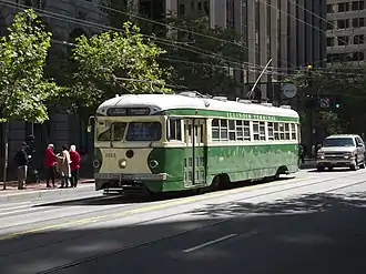 Muni owns a large selection of equipment for use on the F line, although not all of them are in service at the same time. The car fleet includes four sub-fleets: PCC streetcars, Peter Witt streetcars, pre-PCC veteran streetcars from San Francisco, and a diverse collection of 10 streetcars and trams from various overseas operators.[23]