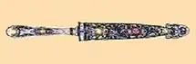 An 1830 article on the facón carried by the gaucho of that era describes it as a "carving knife" with a blade fourteen inches in length; it was carried in a leather sheath worn either in a waist sash or tucked into leggings.[8] Most examples of the facón have crude decorations and are poorly fitted.[1] Some examples were converted from cut-down swords, while others used blades imported from as far away as England.[1]