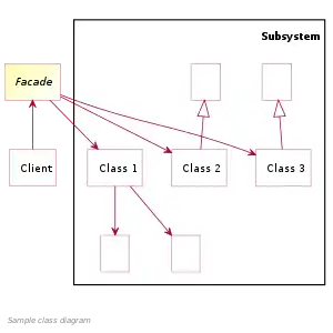 Instead, the Client works through a Facade class that implements a simple interface in terms of (by delegating to) the subsystem classes (Class1, Class2, and Class3).