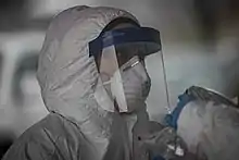 Elastomeric respirators are reusable personal protective equipment comprising a tight-fitting half facepiece or full facepiece respirator with exchangeable filters such as cartridge filters.[42] They provide an alternative respiratory protection option to filtering facepiece respirators such as N95 masks for healthcare workers during times of short supply caused by the pandemic, as they can be reused over an extended period in healthcare settings.[42][43] However, elastomeric respirators have a vent to exhalate the air outwards and unfiltered, so the wearer must be attentive that he or she is not infected with SARS-CoV-2, to prevent a possible transmission of the virus to others through the vent.[43]