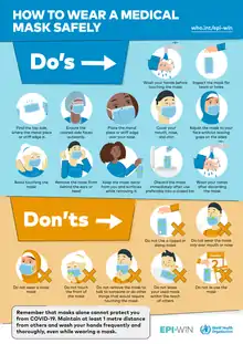 Previously, early in the outbreak, the WHO had only recommended medical masks for people with suspected infection and respiratory symptoms, their caregivers and those sharing living space, and healthcare workers.[55][56] In a 6 April advice, the WHO recognized that wearing a medical mask can limit the spread of certain respiratory viral diseases including COVID-19, but believed that the use of a mask alone is not sufficient to provide an adequate level of protection and that other measures (such as hand hygiene) should be adopted.[57] In the scope of the community setting, the WHO stated that medical masks should be reserved for healthcare workers, except for people with symptoms, claiming that medical masks would create a false sense of security and neglect of other measures.[57] The WHO advice for people to wear masks only if they had symptoms was scrutinized, as experts and researchers have pointed out the asymptomatic transmission of the virus.[58][59][60][61][62] The WHO revised its mask guidance in June, with its officials acknowledging that studies have indicated asymptomatic or pre-symptomatic spread but that not much is known.[63]