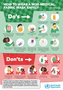 Regarding the use of non-medical fabric masks in the general population, the WHO has stated that high-quality evidence for its widespread use is limited, but advises governments to encourage its use as physical distancing may not be possible in some settings, there is some evidence for asymptomatic transmission, and masks could be helpful to provide a barrier to limit the spread of potentially infectious droplets.[66]