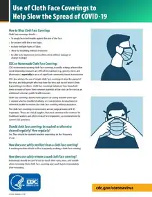 The United States Centers for Disease Control and Prevention (CDC) since 3 April 2020 recommend that people wear a cloth face covering in public.[69] In its guidance, since 28 June, the "CDC recommends that people wear cloth face coverings in public settings and when around people who don't live in your household, especially when other social distancing measures are difficult to maintain. Cloth face coverings may help prevent people who have COVID-19 from spreading the virus to others. Cloth face coverings are most likely to reduce the spread of COVID-19 when they are widely used by people in public settings."[70]