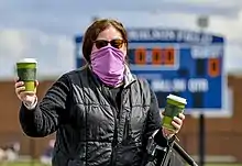 The Washington Post reported that in an April 2020 poll, 79% of self-identified Democrats and 59% of Republicans stated that they had worn a mask or other face covering in public. Those who knew someone who had been infected with COVID-19 were 40% more likely to wear a mask in public than those who didn't.[76] A Gallup poll the same month found that 75% of Democrats and 48% of Republicans had worn a mask outside in the past week.[77] In a June 2020 survey by Politico and Morning Consult, 60% of those who said they supported the wearing of masks also stated that their opinion of the Trump administration was "very favorable".[78]