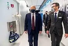 Trump subsequently avoided being seen wearing face masks during on-camera appearances (such as, in one case, a factory producing face masks).[93][21] When visiting the Mayo Clinic on April 28, Vice President Mike Pence followed suit, despite the clinic having mandated the wearing of masks by all visitors and staff. Pence stated that he did not wear a mask because he was being regularly tested negative for COVID-19, and that "I thought it'd be a good opportunity for me to be here, to be able to speak to these researchers, these incredible health care personnel, and look them in the eye and say 'thank you'."[94] When visiting a ventilator factory on April 30, however, Pence was seen wearing a mask.[6]