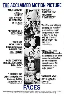 Faces is a 1968 American drama film written and directed by John Cassavetes. It stars John Marley, Gena Rowlands, Lynn Carlin (in her acting debut), Seymour Cassel, Fred Draper and Val Avery.