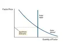 Distribution of national income is determined by factor payments (factor prices). Factor payments include rent, wages, interest and profit.[4] The prices for factor of production depends upon demand and supply of that particular factor of production. Assume that the factors of production in the economy are fixed and hence the factor supply curve is vertical. Equilibrium of factor payments is determined by the intersection of the downward-sloping factor demand curve and the vertical supply curve. The optimal factor payments are determined through their respective markets i.e. the market clearing prices of the factors of production. There are three major factor of production Land, Labor, Capital.[5]