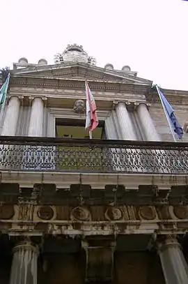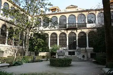 The name Palacio de las Columnas was probably inspired by the Doric and Ionic columns that decorate its facade. The building, one of the most notable examples of secular Neoclassical architecture in Granada, has a U-shaped plant surrounding an ample garden, with a main body and two wings that rise over the downhill-sloped streets on either side. It contains the library, a multimedia classroom, computer and language labs, and administrative and faculty offices.
