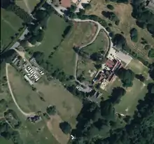 Twenty years on many of the trees had been felled and a walled garden created to the west of the house, accompanied by four glasshouses. A turning circle had been added to the driveway in front of the house, and additional buildings around the Quobliegh Ponds: a boathouse on the northern side and a hide to the southeast. The avenue southwards from the house is not shown on maps from this era but some of the trees remained in place.[1]