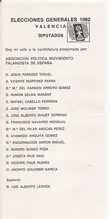 The organization was formed in 1979, by several Falangist dissident organizations, especially former members of the Círculos Doctrinarios José Antonio (José Antonio Doctrine Circles) and some Spanish Independent Falange members. In the general elections of 1982 MFE gained 8,976 votes. In 1983 a section of the Youth Front joined the party. Since then the party has always achieved very poor election results, with some exceptions. The most notable of those exceptions is Santoña (Cantabria), where the party had 1 town councillor from 1999 to 2015, even participating in local governments with the People's Party and the Regionalist Party of Cantabria.[2] The party finally lost its councillor in the local elections of 2015.[3]