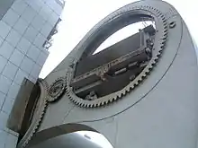 Each end of each caisson is supported on small wheels, which run on rails on the inside face of the 8 m (26 ft) diameter holes at the ends of the arms.[39] The rotation is controlled by a train of gears: an alternating pattern of three 8 m (26 ft) diameter ring gears and two smaller idler gears, all with external teeth, as shown in the picture.[39] The large central gear is fitted loosely over the axle at its machine-room end and fixed in place prevent it from rotating.[38][39] The two smaller gears are fixed to each of the arms of the wheel at its machine-room end. When the motors rotate the central axle, the arms swing and the small gears engage the central gear, which results in the smaller gears rotating at a higher speed than the wheel but in the same direction. The smaller gears engage the large ring gears at the end of the caissons, driving them at the same speed as the wheel but in the opposite direction. This cancels the rotation due to the arms and keeps the caissons stable and perfectly level.[39]