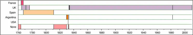 The British claim to sovereignty dates from 1690, when they were the first to land on the islands,[1] and the United Kingdom has exercised de facto sovereignty over the archipelago almost continuously since 1833. Argentina has long disputed this claim, having been in control of the islands for a few years prior to 1833. The dispute escalated in 1982, when Argentina invaded the islands, precipitating the Falklands War.