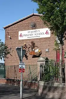There are currently two other primary schools in the Lower Falls district. These are St. Peter's[16] on Ross Road and St. Joseph's[17] on Slate Street. In addition, there is the Irish language Gaelscoil an Lonnáin at the top end of Leeson Street. Several older schools closed in the late twentieth century due to declining student numbers. These include St Finian's and St Gall's primary schools which were run by the De La Salle Christian Brothers. St Comgall's Public Elementary School, in Divis Street, opened in 1932 but closed in 1988.[18] St. Brendan's Primary School on nearby Milford Street closed in the 1960s but for two years housed some pupils from St. Mary's Christian Brothers' Grammar School which at that time had exceeded its capacity in its Barrack Street premises.