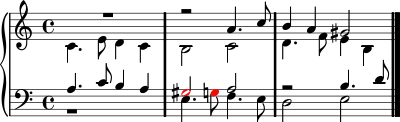 In the above example, a chromatic false relation occurs in two adjacent voices sounding at the same time (shown in red). The tenor voice sings G♯ while the bass sings G♮ momentarily beneath it, producing the clash of an augmented unison.