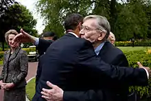 A maternal 3rd great-grandfather of Barack Obama, nicknamed "Fully."[71] Born circa 1829 in Moneygall, King's County, Ireland, he emigrated to Ohio via New York in 1850, making him the most recent immigrant on the maternal side of Barack Obama's family tree. Fulmoth married Charlotte Holloway and raised a family which included three daughters (including Mary Ann). She and two of her sisters married three Dunham brothers. Kearney and his wife are buried in Fairview Cemetery in Labette County, Kansas. Descendants placed a headstone there in 2014.[72] Around the same time, a photo of him was discovered.[73][71] Barack Obama visited Moneygall in 2011.[74] In 2014, "Barack Obama Plaza," a service station and visitor centre, was opened in Moneygall.[75] In 2015, a photograph of Kearney was discovered and made publicly available. In 2018, statues of Michelle and Barack were erected in Moneygall.[76]