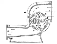 The cross-flow or tangential fan, sometimes known as a tubular fan, was patented in 1893 by Paul Mortier,[15] and is used extensively in heating, ventilation, and air conditioning (HVAC), especially in ductless split air conditioners. The fan is usually long concerning the diameter, so the flow remains approximately two-dimensional away from the ends. The cross-flow fan uses an impeller with forward-curved blades, placed in a housing consisting of a rear wall and a vortex wall. Unlike radial machines, the main flow moves transversely across the impeller, passing the blading twice.