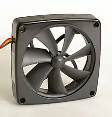 Fans generate noise from the rapid flow of air around blades and obstacles causing vortexes, and from the motor. Fan noise is roughly proportional to the fifth power of fan speed; halving speed reduces noise by about 15 dB.[20]