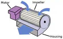 A cross-flow fan is a centrifugal fan in which the air flows straight through the fan instead of at a right angle. The rotor of a cross-flow fan is covered to create a pressure differential. Cross-flow fans are made to have a double circular arc rear wall with a thick vortex wall that decreases in radial gap. The gap decreases in the direction of the fans impeller rotation. The rear wall has a log-spiral profile while the vortex stabilizer is a horizontal thin wall with rounded edge.[16] The resultant pressure difference allows air to flow straight through the fan, even though the fan blades counter the flow of air on one side of the rotation. Cross-flow fans give airflow along the entire width of the fan; however, they are noisier than ordinary centrifugal fans, presumably because the fan blades fight the flow of air on one side of the rotation, unlike typical centrifugal fans. Cross-flow fans are often used in ductless air conditioners, air doors, in some types of laptop coolers, in automobile ventilation systems, and for cooling in medium-sized equipment such as photocopiers.