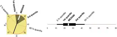 The scale on the circular line begins at the left with the starting value (e. g. with zero). The following values are applicated clockwise. The white tail of diameter indicates the median. The dark fan indicates the dispersion of the middle half of the observed values; thus it encompasses the values from the first to the third quartile. The white feathers indicate the dispersion of the middle 90% of the observed values.