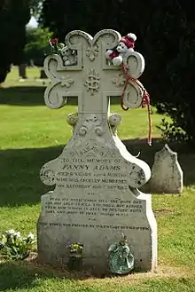 Sacred to the memory of Fanny Adams aged 8 years and 4 months who was cruelly murdered on Saturday August 24th 1867. Fear not them which kill the body but are not able to kill the soul but rather fear Him which is able to destroy both body and soul in hell. Matthew 10 v 28.