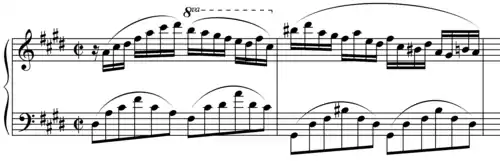 The piece uses many cross-rhythms (the right hand plays sixteenth notes against the left hand playing triplets) and a ceaselessly moving note figuration, and is in cut time (2