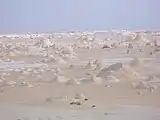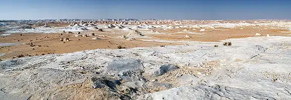 A main geographic attraction of Farafra is its White Desert (known as Sahara el Beyda) — a national park of Egypt and 45 km (28 mi) north of the town of Farafra, the main draw of which is its rock type colored from snow-white to cream. It has massive chalk rock formations that are textbook examples of ventifact and which have been created as a result of occasional sandstorm in the area. The White Desert is a typical place visited by some schools in Egypt, as a location for camping trips