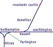 Farlington Halt railway station is a disused station between Bedhampton and Hilsea , located immediately to the west of Farlington Junction on the Portsmouth Direct Line railway.[1]