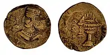 Neither Adur-Sasan nor Tirdat is known to have ruled, which implies that Farn-Sasan was seemingly from a cadet branch of the dynasty.[3] On the obverse of his coins, he is portrayed with a cap. On the reverse, a fire altar is depicted, with an inscription circled around it.[6] Farn-Sasan is the only king known to show a fire altar on coins originating from Sakastan. Around the same time, another king issued coins with a similar fire-altar depicted on it, which was the Sasanian ruler Ardashir I (r. 224–242), who around the same time was extending his domains into the east.[7] It is uncertain if Farn-Sasan copied the iconography of Ardashir I's reverse coins, or vice versa.[5] The resemblance of the coinage of Farn-Sasan and the Sasanian Ardashir I, including the shared name Sasan—a name popular in the Indo-Parthian realm—suggests that the Sasanians and Indo-Parthians possibly shared a common ancestry.[8][1] Modern historians regard them as rivals and claimants to the title of King of Kings.[9] The Iranologist Khodadad Rezakhani argues that Farn-Sasan was a superior of Ardashir I, and that the latter was only able to declare himself Kings of Kings after he defeated Farn-Sasan in 226, which marked the end of Indo-Parthian rule.[10][11]