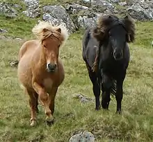 The Faroe pony, Faeroes pony, or Faroese horse,[1] (Føroyska rossið in Faroese) is a small pony, with a height between 11.1 to 12.1 hands (45 to 49 inches, 114 to 124 cm). Technically this animal is a pony due to its height, but in the Faroe Islands it is called a horse because of its strength. The Faroe pony is only to be seen on the Faroe Islands and is therefore little known in other countries. There are only 73 Faroe ponies left living on the Faroe Islands.