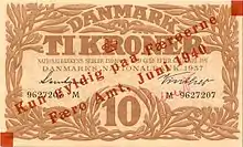 From 14 October 1940, new banknotes were printed "on behalf of the National Bank of Denmark."[2] The value of these new banknotes was the same as those already in use. On 18 December 1940, a Currency Central was established in order to monitor foreign trade and to secure the solvency of the Faroes. Currency Central was headed by a board of nine, the judge, who was chairman, one representative of Faroe Fish Export, one representative of the Faroese Merchants' Union, one representative of the bank Føroya Banki, one representative of the savings bank Føroya Sparikassi and four representatives of the Løgting.[3]