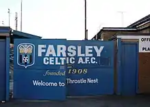 The club was established in 1908 as Farsley Football Club and played in amateur leagues in Leeds.[3] They joined the West Riding County Amateur League in 1926 and were runners-up in 1936–37.[4] In 1949 they joined Division Two of the Yorkshire League. They won the Division in 1951–52, earning promotion to Division One.[5] After three bottom-half finishes, league performances improved and Farsley finished fifth in 1955–56 and fourth in 1956–57, before ending the season as runners-up in both 1957–58 and 1958–59.[5] The 1959–60 season saw them win the league for the first time, and throughout the 1960s the club finished in the top seven of the league. They were champions again in 1968–69 and runners-up in 1970–71 and 1971–72.[5] In 1974–75 the club reached the first round of the FA Cup for the first time, losing 2–0 at home to Third Division Tranmere Rovers in a match moved to Elland Road to accommodate the record 11,000 crowd.[3] After finishing in the bottom four of Division One the following season, the club were relegated to Division Two. The following season saw them finish fourth in Division Two, earning promotion back to Division One. However, their stay in Division One only lasted one season as they were relegated again at the end of the 1977–78 season. After three years in Division Two they were promoted back to Division One at the end of the 1980–81 season.