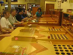The game consists of a wooden table, roughly 1.3 metres (4 ft 3 in) long, 50 centimetres (20 in) wide and 1 metre (3 ft 3 in) high. The player sits at one narrow end of the table. At the other end of the table is a series of 25 holes, roughly 5 cm (2.0 in) in diameter, arranged in a five-by-five square matrix. The player rolls a rubber ball, similar to a racquetball or handball, toward the holes; the ball is only slightly smaller than the holes. As the ball falls through one of the holes, a light on a backboard behind the holes lights up, in a pattern corresponding to the hole the ball fell through. The ball then rolls back to the player on a slight incline slanted back from the holes. The process is repeated until a player lights five lights in a row, either across the matrix, in a vertical column, or on a diagonal, much like bingo—indeed, like bingo, the hole in the center of the matrix is a "free space." A glass plate over the front part of the table keeps players from reaching too far over the table to improve their aim.