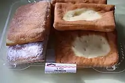 In parts of Maryland, the treats are called Kinklings,[4][5] or "Kuechles" (not to be confused with kichel) and are only sold in bakeries on Shrove Tuesday. The German version is made from a yeast dough, deep fried, and coated or dusted in powdered sugar or cinnamon sugar; they may be plain or filled with fruit jam. Pennsylvania Dutch fasnachts can often be potato doughnuts, and may be uncoated, dusted with table sugar, or powdered with confectioner's sugar.[1][2][3]