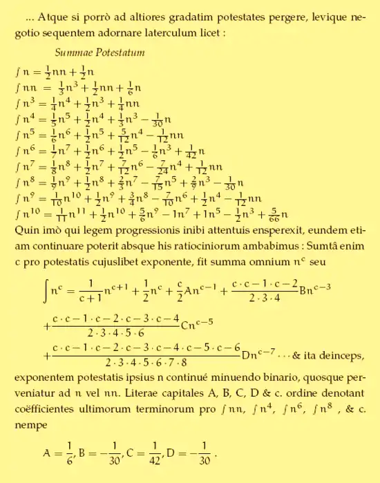 In 1713, Jacob Bernoulli published under the title Summae Potestatum an expression of the sum of the p powers of the n first integers as a (p + 1)th-degree polynomial function of n, with coefficients involving numbers Bj, now called Bernoulli numbers: