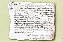 On 13 September 1935, while still in Vilnius, Kowalska wrote of a vision about the Chaplet of Divine Mercy in her diary (Notebook I, Item 476).[22] The chaplet is about a third of the length of the Rosary.[23] Kowalska wrote that the purpose for chaplet's prayers for mercy are threefold: to obtain mercy, to trust in Christ's mercy and to show mercy to others.[24]