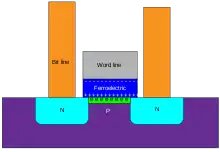 Use of a ferroelectric (triglycine sulfate) in a solid state memory was proposed by Moll and Tarui in 1963 using a thin film transistor.[1] Further research occurred in the 1960s, but the retention characteristics of the thin film based devices was unsatisfactory.[2] Early field effect transistor based devices used bismuth titanate (Bi4Ti3O12) ferroelectric, or Pb1-xLnxTiO3 (PLT) and related mixed zironconate/titanates (PLZT).[2] In the late 1980 Ferroelectric RAM was developed, using a ferroelectric thin film as capacitor, connected to an addressing FET.[2]