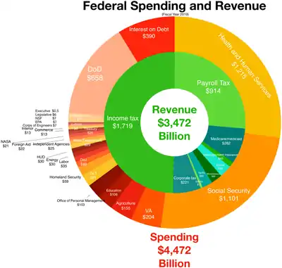 For fiscal year (FY) 2018, the federal government spent $4.11 trillion. Spending equalled 20.3% of gross domestic product (GDP), equal to the 50-year average.[17] The deficit equalled $779 billion, 3.8 percent of GDP. Tax revenue amounted to $3.33 trillion, with receipt categories including individual income taxes ($1,684B or 51%), Social Security/Social Insurance taxes ($1,171B or 35%), and corporate taxes ($205B or 6%).[17]